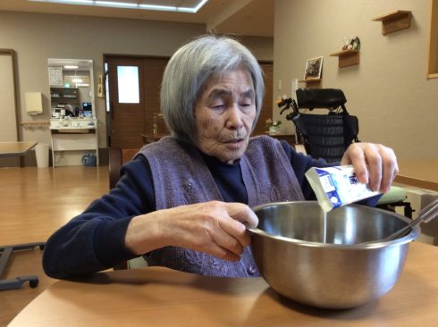 ボールに牛乳を真剣なまなざしで入れられてます。目分量でしたが、昔の経験を活かされ丁度良い加減でした。