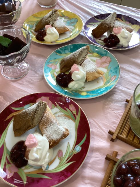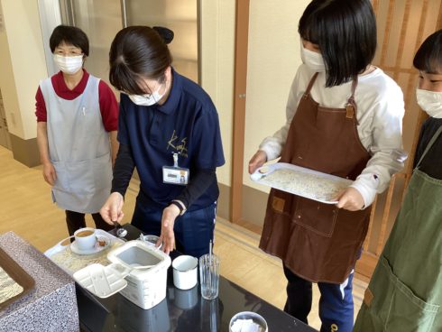 味酒野ていれぎ荘の管理栄養士を中心に色々なデザートと飲み物を準備しています。