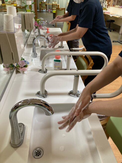 しかし、最近では気温が上がり食中毒などのリスクが高まってきたこともあり「食中毒の理解を深める」「手洗いや手指消毒の徹底」のための研修を行いました。