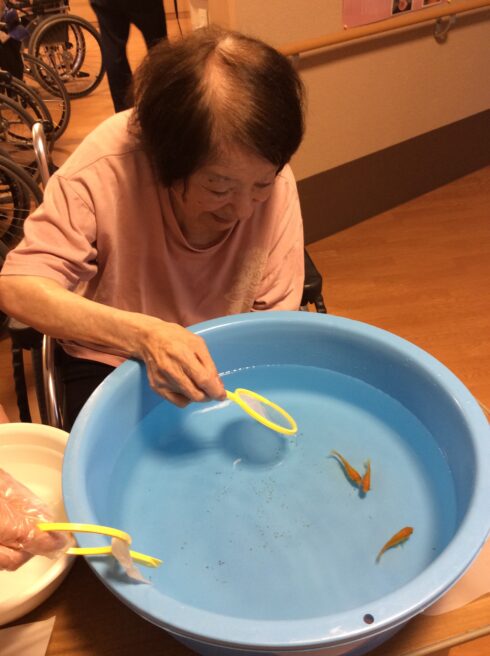 スイカ割り後に金魚すくいも行い、手首を使い、金魚を追って、上手く金魚すくいをされていました。