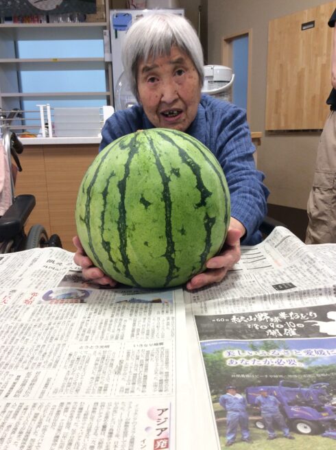 スイカを近くに持って行き、利用者様に持ってもらうと「重たくてようもてんわ」と言われて笑われていました。