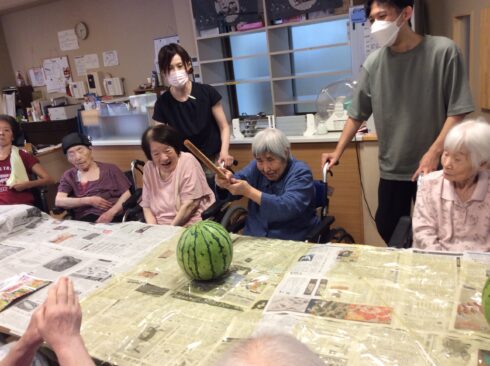 割れたスイカを利用者様に見てもらうと、「すごい真っ赤。おいしそう。早く食べたい」と要望も聞かれ割れたスイカを切って、見守りを行いながら食べてもらいました。