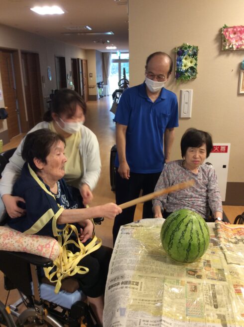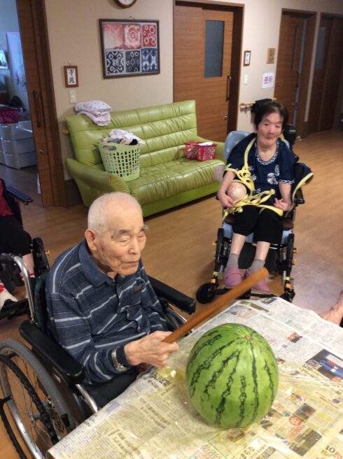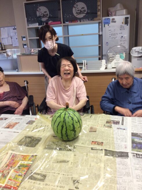 ご利用者様皆さん、スイカを見られ、「立派なスイカやねー。凄い大きいね。」等お話しをされていました。