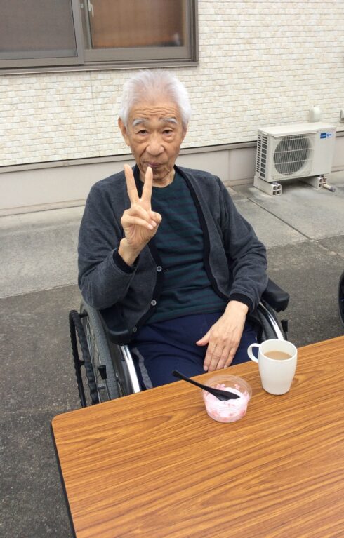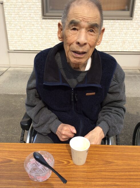 桜は三分咲き程度でしたが、春の雰囲気を感じながら手作りのカップケーキ・フルーチェをおやつとして召し上がっていただきました。「外で食べるとおいしいね」などの声が聞かれ皆さま穏やかなひとときを過ごされていました。